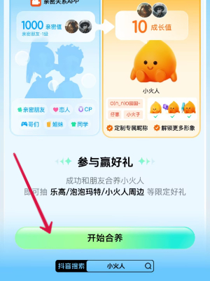 1、玩家首先进入抖音合养小火人限时活动中,点击活动界面下方的【开始合养】。