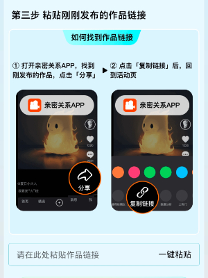 4、返回抖音小火人活动中,将刚刚在亲密关系app上发布的小火人作品链接复制粘贴到活动页面的输入框中就可以开启自己的合养之旅。
