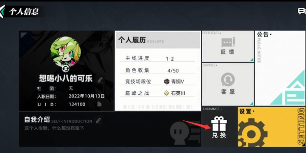 2、接着我们就进入到个人信息页面,在此页面就可以看到礼包兑换的窗口,点击进入即可。
