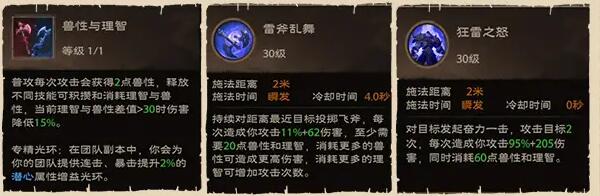 雷斧乱舞:持续对距离最近目标投掷飞斧,每次造成你攻击11%+62伤害,至少需要20点兽性和理智,消蚝更多的兽性可造成更高伤害,消耗更多的理智可增加攻击次数。