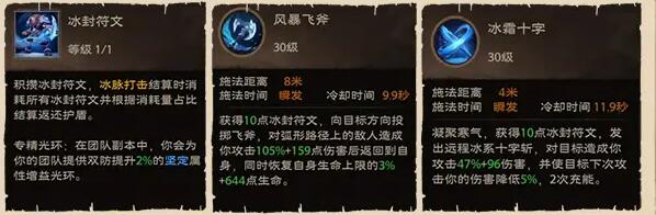 风暴飞斧:获得10点冰封符文,向目标方向投掷飞斧。对弧形路径上的敌人造成你攻击105%+159点伤害后返回到自身,同时恢复自身生命上限的3%+644点生命。