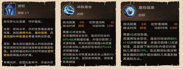 盾挡强袭:需要40点攻势值,用盾牌攻击目标,造成你攻击的88%+145点物理伤害,并使你获得12点坚切值,且在接下来的8秒内使你的偏斜几率增加19%。在此期间如果没有触发偏斜则额外增加偏斜几率直到触发偏斜为止。