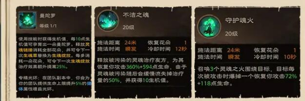 曼陀罗:使用技能时获得生机值,每10点生机值可孕育出一朵曼陀罗。释放灵魂链接消耗全部花朵,并可令下一次生魂草替换为生魂绽放。每多消耗一朵花朵,可令下一次生魂绽放治疗效果额外提高25%。