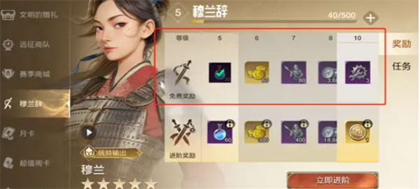 参加穆兰辞活动可以获得免费奖励,进阶奖励需要解锁。