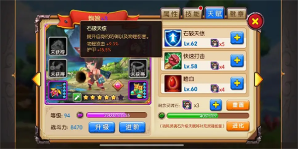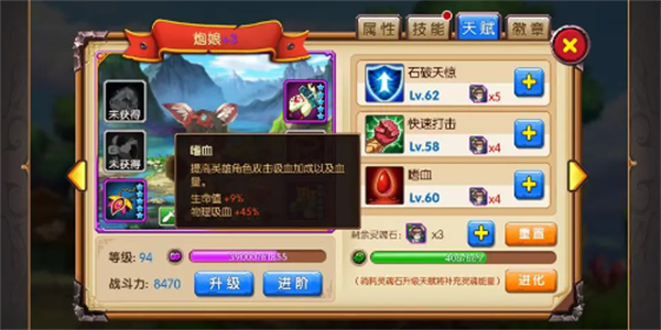 3、嗜血:提高英雄角色攻击吸血加成以及血量。