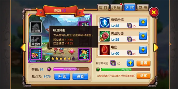 2、快速打击:为英雄角色增加攻速和移动速度。
