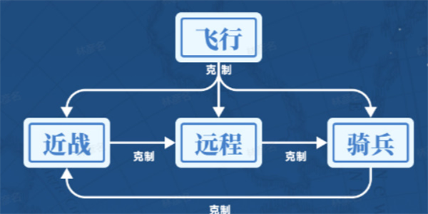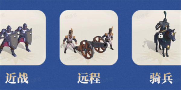 2、在前期游戏环境中,我们一般只能掌握三类兵种。分别是近战、远程和骑兵。三者处于相互克制关系。