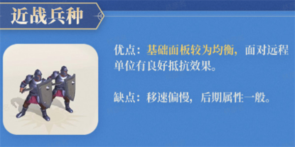 1、近战可以克制远程兵种但被骑兵所克制,在游戏前期大部分英雄都是以近战兵种为核心。游戏后期近战兵种就比较无力了。