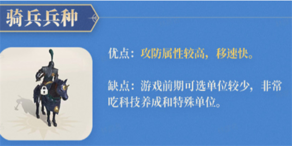3、骑兵可以克制近战兵种但被远程所克制,骑兵在游戏中前期受制于科技和特殊单位的限制,兵种属性不高能力比较一般,需要到后期科技上去之后伤害以及速度就都有了。
