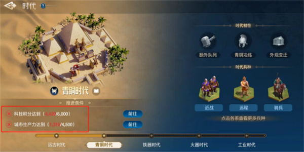 2、世界启元分为远古时代、青铜时代、铁器时代、火器时代、工业时代、电气时代,想进入下一时代需要满足一定的科技积分与城市生产力,每当点亮科技树上的一个科技,就会获得一定的积分,比如从青铜时代进入铁器时代,需要6000科技积分,而在青铜时代,点亮科技树上的“货币”科技,就会获得480积分,当我们点够6000积分、城市生产力达到4500,就能进入铁器时代了。