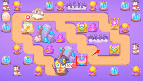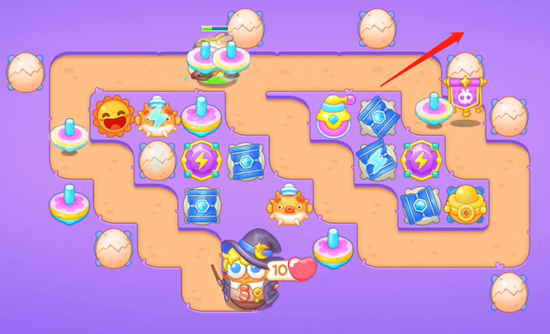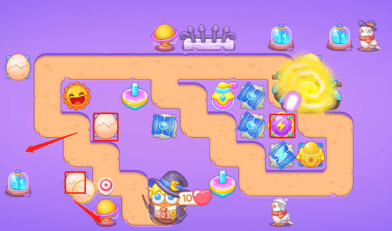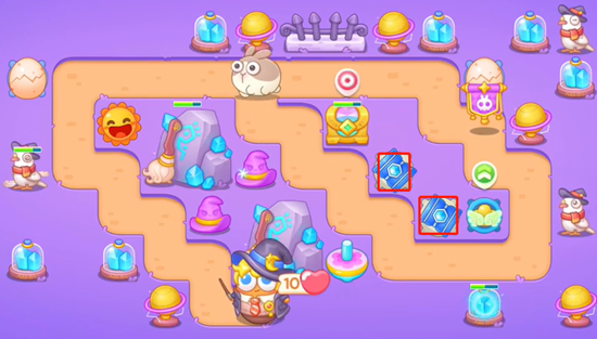 1、在中间位置放上陀螺,左边补充一个蛋蛋收割,没有小怪怪的时候把周围小道具清理掉。