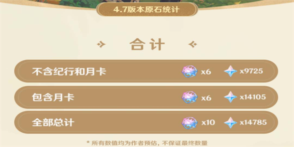 原神4.7版本原石获取统计,原神4.7版本上线的新的限定角色,有的玩家可能会想要抽取,但是不知道可以在4.7版本可以获得多少原石进行抽取,下面就给大家带来了4.7版本中可以拿到多少原石,有需要的玩家一起在下面看看吧。