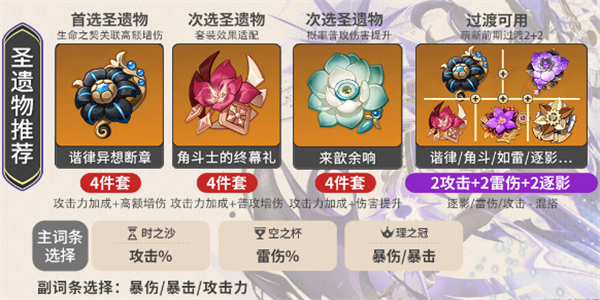 1、套装选择:谐律四件套、角斗士四件套,余响四件套,2攻击+2雷伤+2逐影散搭。