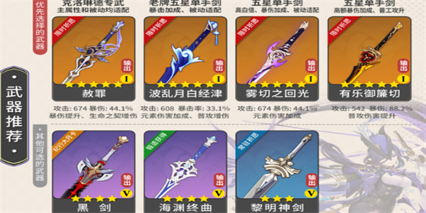 优先考虑第一排的武器,其次考虑第二排的武器。至于五星武器“磐岩结绿”没有加入推荐的原因,克洛琳德自身具备44.2%的基础暴击率,而“磐岩结绿”自身同样具备44.1%的高额暴击,极大概率造成暴击溢出,圣遗物配平具有极大压力,故没有推荐。