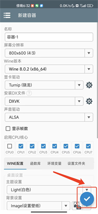 3、可以根据自己手机配置选择设置(大家可以尽量选择低一些的配置,不然可能会卡顿)然后右下角点击创建容器即可。