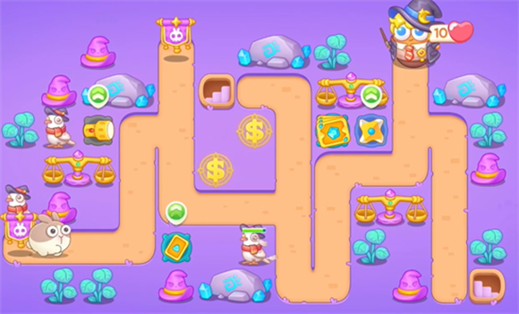 2、打掉道具之后,我们在魔法阵上面继续放置卡牌,增加前面的清线能力,然后使用后面的炮台清理右边的道具。
