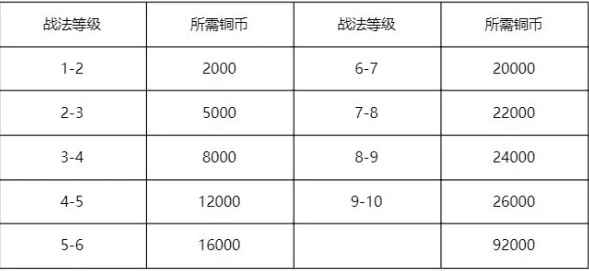 1、战法升级所需要的铜币数量是随着战法等级大幅度提高的,每级战法所需要的铜币需要13.5万铜币才能满级。