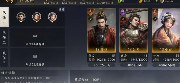 3、由于前期铜币缺乏,无法支持两队同时出战,因此,主公们可以将第一队的体力刷光然后放到练兵所练级(前期不要开加速),然后将所有战法重置投入到第二队继续练级。第三队前期用作屯兵队即可。