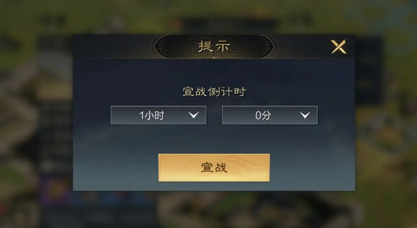 2、建好攻城大营后,点击城池的【宣战】就可以准备开战了。攻城可以设定倒计时,因此盟主可以在统筹好全盟时间后选择合适的时间发起攻城。