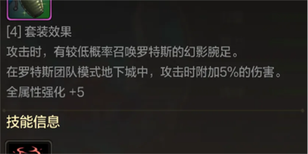 4、装备了罗特斯宠物会获得专属套装效果,可以增加5点全属性强化,以及在罗特斯团本里攻击附加5%的伤害。