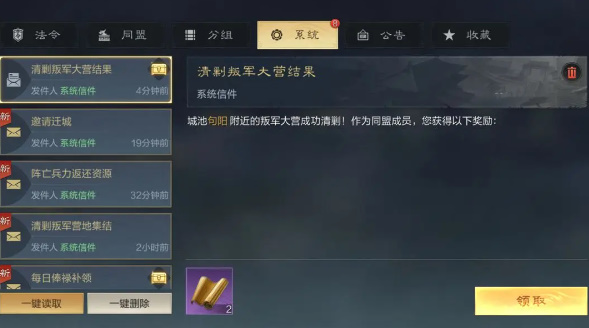 3、参加清剿的同盟成员可以获得同盟贡献,清剿完成后,同盟可以获得资金、装备、坐骑等奖励,全盟成员(包括未参与清缴的主公)都能获得刷新韬略必备的书简。
