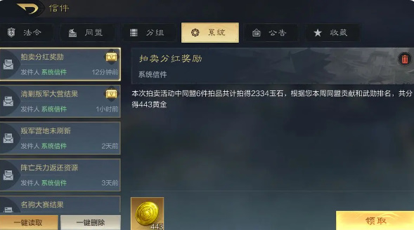 5、拍卖物品需要用玉石竞价,拍卖结束后,花费的全部玉石会转化为同样数量的黄金,并以信件形式为同盟成员分红。分红比例受同盟贡献与武勋排名影响,同盟贡献和武勋排名越高,分红便越多。
