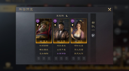 董卓的【权倾朝野】与邹氏的【烈火焚营】可以打出多段伤害,能帮助李儒快速叠加“鸩毒”状态,邹氏自带战法【顾盼生姿】补足了队伍的回复和生存短板,使队伍更加坚韧。