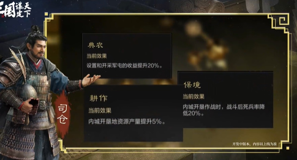 介绍:司仓的三个主动技能。一是在已攻占的土地上开启共享资源,可以让盟友开采,同时自己也可以开采一次。二是在指定城池或者同盟大营直接生产辎重,三是可以每天给自己生产一次全资源,生产数量与内城土地的产量有关。