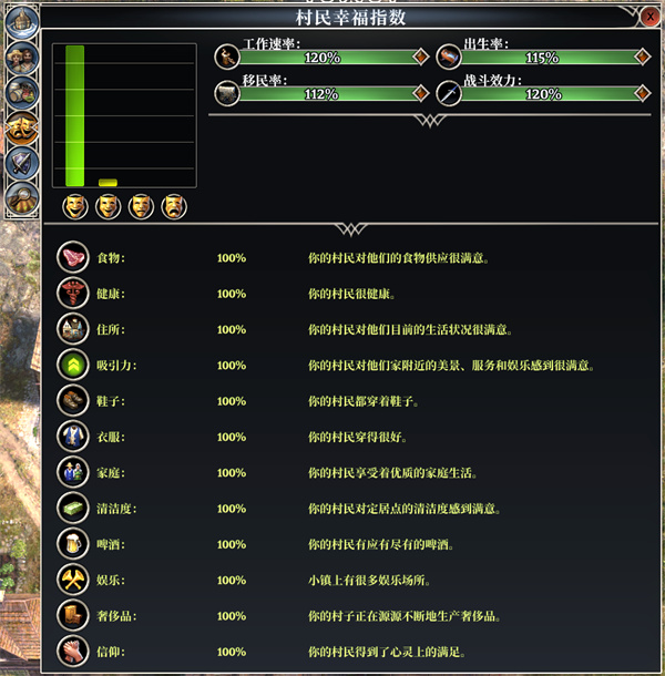 鞋子:保证皮鞋充足,需要控制婴儿出生,因为婴儿是不穿鞋子和衣服的,但是却占用指数,只有等长到幼童才会穿鞋穿衣,控制方法是建造多个住宅快速加人口,在鞋子衣服充足的情况下,没住所的村民不会直接死亡,然后每年会有一部分居民因为年迈死亡,婴儿也会每过几年变成幼童,等所有婴儿都变成幼童了,再建造住所,把人口控制好,当有居民年迈死亡,空出多余住所的时候,拆除一些住所,让几个人没地方住,控制婴儿出生,总人数在400人左右,有1-2个婴儿也不影响100%的指标。