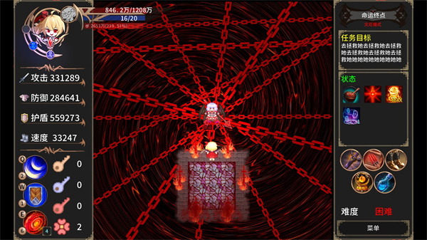 这个区域的前半段利用罪孽提供的高攻击,秒掉4个罪天平后,此时需要控制好攻击不能太高,必要时可关闭自动拾取,避免拿攻击宝石,至少保证自己输出最低的情况下(左上角三灯全灭)怪物狂信徒依然能降低自己的罪孽;