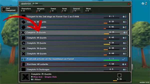在游戏中完成至少 25 个任务,这些任务可以是角色、武器、书籍、物品、将军或皮肤类别中的任何可用任务。