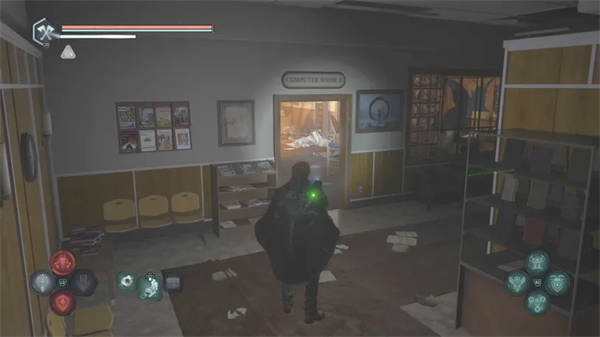继续沿着主通道进入二楼图书馆,继续前行,直到找到左侧的第一个门口,即可到达电脑室 D。