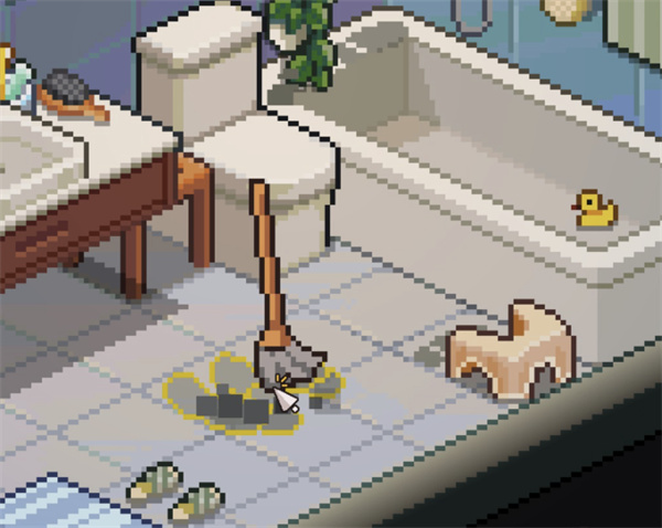 完成新手任务后出门在邮箱接取露娜(红头发妹妹)需要你帮忙摆家的任务,来到家左下方的露娜家,在收拾卫生间的时候会发现地上有很多污渍。