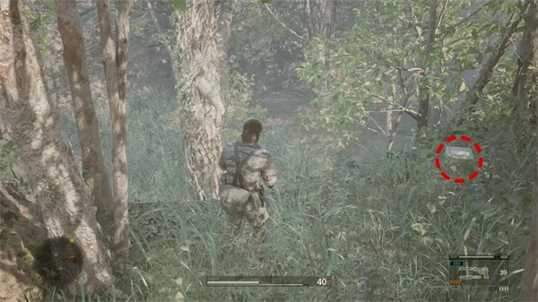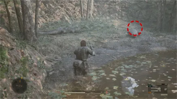 在下一个沼泽区域,取下消音器并击落大黄蜂巢穴,使用俯冲来安全通过。你会捡到药膏和一个马蜂窝,以及一些隐藏在灌木丛中的 MK22 弹药。