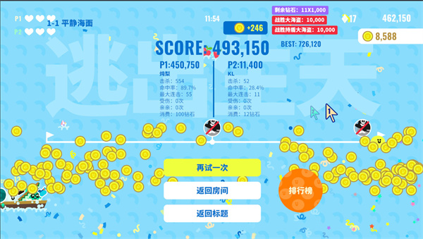 也可以尝试双幽灵组合(1手枪1水枪),选择幽灵的好处是可以无视花朵、海盗及海盗boss的子弹,只要防止有怪物接近船就行。