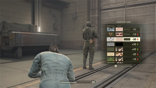Snake 的可见度将始终通过屏幕底部的迷彩指数显示 - 百分比越高,Snake 目前融入周围环境的效率就越高。你的伪装在这里产生了巨大的影响,你可以从生存菜单中更改它,以便更有效地融入其中,但 Delta 还引入了一个动态伪装快速菜单,您可以在游戏过程中通过按住方向键上的 Up 来调出该菜单。