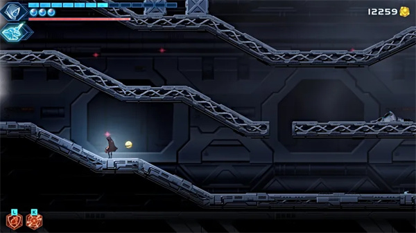 在下一个区域,沿着走廊向左走,然后到达上面的大房间。同样,你需要击败在大型移动平台上巡逻的敌人。完成后,前往左侧的两个平行管道出口。