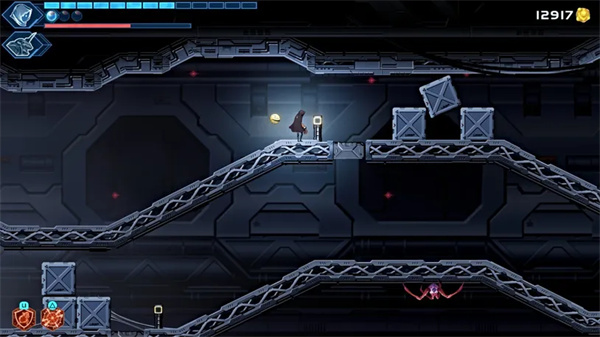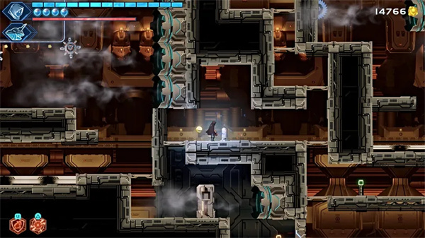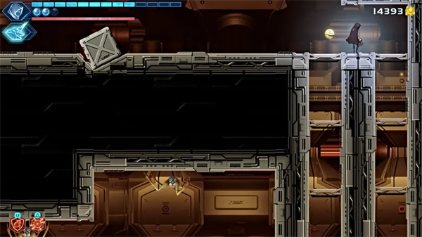 在下一个区域,乘坐中央电梯平台上去,立即打破左侧的橙色屏障。然后爬上薄平台,到达上面的大房间。你在这里的目标是到达顶部,所以向左跑并跳上移动平台。