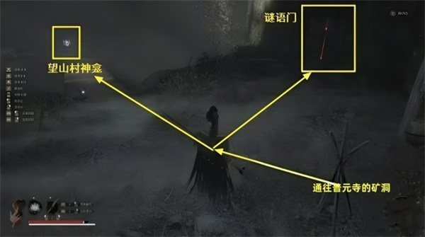 这个谜题门就在矿洞出口右侧,桥对面是【云顶城-望山村】的神龛。