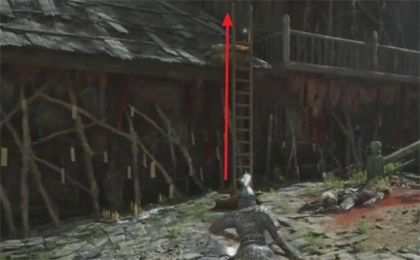 7、直走到对面茅草屋顶,爬右边梯子下去,下层右侧还有一个梯子,继续爬第二段梯子。