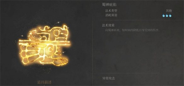 法术效果:向蜀神祈祷,短时间内降低自身受到的伤害。
