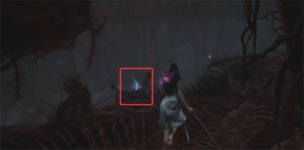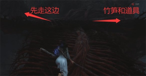 这里我们就不闪避了,直接掉下去,顺着路走就会来到一个岔路口右边是一个小竹笋和暗淡红雨道具。