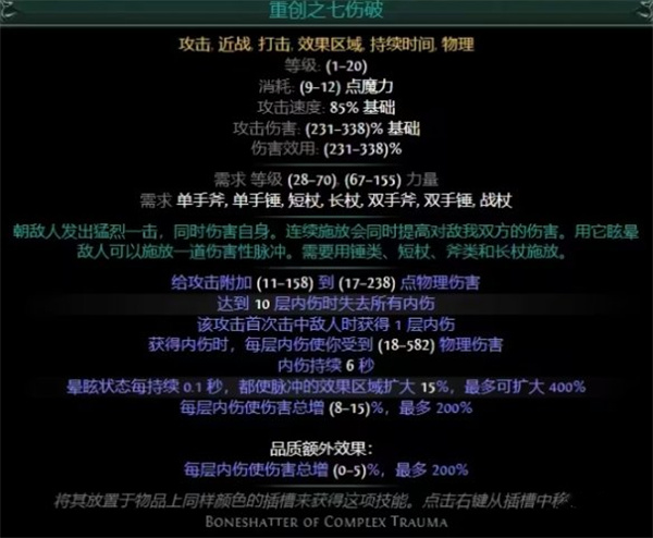 在技能等级20时的伤害系数高达1014%,是非反击技能里伤害系数最高的技能,而且还自带点伤。