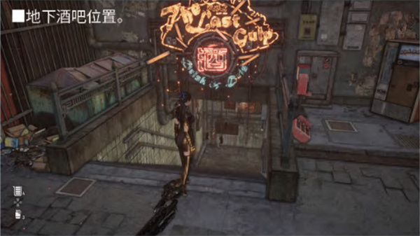 来到姐妹废品场北侧的小巷,从图示位置进入一家地下酒吧,然后可以在酒吧内的钢琴旁看见一位身体残缺的少女“恩雅”,与之对话即可接受任务。