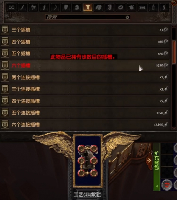 放入装备,选择六个插槽先出六孔。然后点击六个连接插槽,点击工艺(非绑定)即可六孔六连。