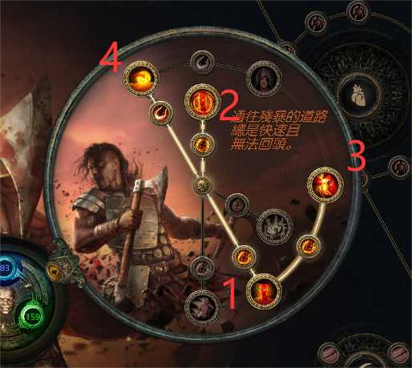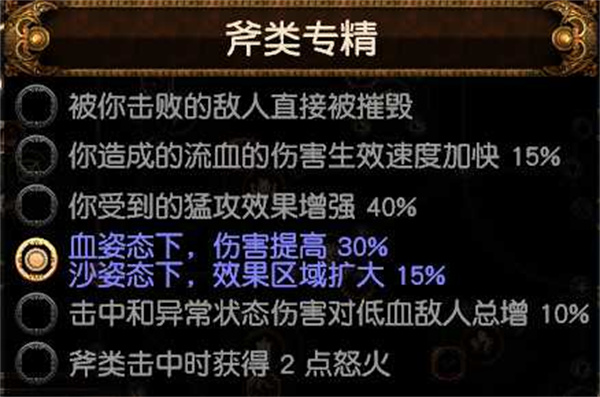 点出斧类专精,选择血姿态提高30%伤害,沙姿态效果区域扩大15%。