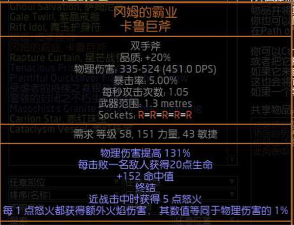 武器:冈姆的霸业 卡鲁巨斧(第一天可能会有点贵,但是产出高,后期肯定会降价,其他装备差不多都能打t17)