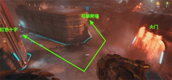 在锁死的火门旁边有两条路径:左侧通往一个交叉锁链,右侧带有可攀爬的墙,便于登上上层。