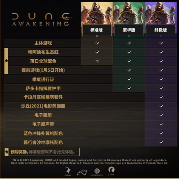 沙丘觉醒将于 6 月 10 日正式上线,游戏分为标准版、豪华版、终极版三个版本,部分玩家不知道这三个版本之间有什么区别,下面就为大家带来沙丘觉醒中不同版本的区别介绍,有需要的玩家可以参考。