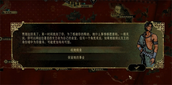 1、做完尸体事件或者选择给贾丽拉赎身触发【女王做妾】事件;
